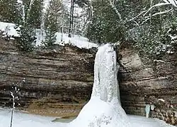 In the winter, the falls freeze forming an ice column. Munising Falls themselves are off-limits to climbers, but ice climbing is popular in the area and there are other spots in the vicinity where climbing is allowed.[1]