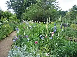 Jekyll transformed Munstead Wood gradually over many years.[3] She allowed the felled woodland to grow back, but thinned the young trees,[9] creating areas of different varieties and different combinations of varieties,[10] and gave each area its own underplantings of flowers and shrubs. The resulting woodland garden was viewed via a series of long woodland walks.[3] Nearer the house the woods merged gradually into lawns.[6] Seasonal gardens flowered in succession through the year: the "spring garden", the "hidden garden", the "June garden",[11] and the main herbaceous border, 200 feet (61 m) long, which flowered from July until October.[12] Each garden displayed carefully arranged shades of colour.[13]