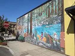 Estacada, Oregon has an extensive collection of public murals. According to 1859's Catie Joyce-Bulay, the city displayed 21 murals, as of 2018. Among them are paintings depicting a Native American tribe fishing at Celilo Falls, a person foraging mushrooms in a forest, and Chinese Americans harvesting ginseng.[1]