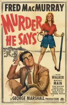 Murder, He Says is a 1945 American black comedy horror film directed by George Marshall and starring Fred MacMurray, Helen Walker, and Marjorie Main.[1] The plot follows a murderous rural family and the hapless pollster who becomes entangled in their hunt for a cache of money. Filmed in the spring of 1944, it was held back for a year because Paramount prioritized releasing war-related films first, lest they suddenly become dated by the impending end of combat.