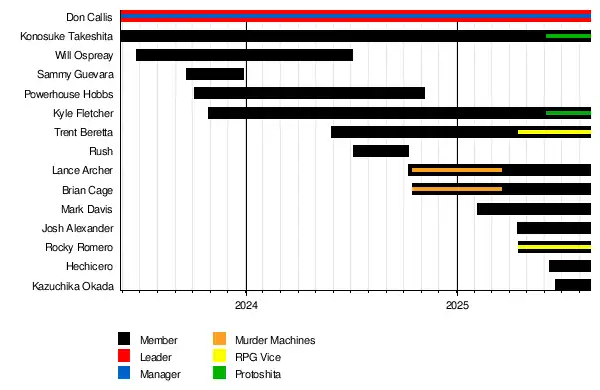 On the February 5, 2025 episode of Dynamite, Callis revealed Mark Davis as the newest member of the Don Callis Family.[9] On April 16 at the Spring BreakThru special edition of Dynamite, Callis recruited the debuting Josh Alexander into the Don Callis Family.[10] On the April 17 at the Spring BreakThru episode of Collision, Rocky Romero turned heel after betraying Tomohiro Ishii in a tag match and participated in attacking Ishii with a returning Beretta and the rest of the Don Callis Family, joining the group and reuniting Roppongi Vice.[11] On June 4 at Collision: Fyter Fest, Hechicero teamed with the newly formed Protoshita (Fletcher and Takeshita) to defeat Bandido and The Outrunners.[12][13] On June 10, Hechicero confirmed that he was now a member of the Don Callis Family.[14] On June 11 at Dynamite: Summer Blockbuster, Kazuchika Okada aligned with Callis during his feud with Kenny Omega and was officially introduced as the newest member on the June 21 episode of Collision.[15][16][17] From July 19, 2025 till August 17, 2025, Takeshita participated in G1 Climax 35, where he advanced out of the B Block with a 6—3 record,[18] defeated David Finlay in the playoffs,[19] Zack Sabre Jr. in the semifinals,[20] and then Evil in the final, making him the first contracted AEW wrestler to win the G1 tournament.[21]