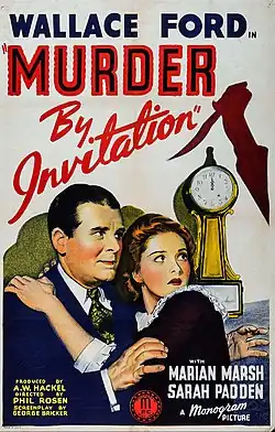 Murder by Invitation is a 1941 American mystery film directed by Phil Rosen and starring Wallace Ford, Marian Marsh and Sarah Padden.[1] It was distributed by Monogram Pictures.