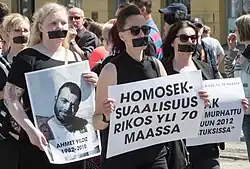 ![]() A marcher with Marching for Those Who Can't holding up a sign in memory of Ahmet Yıldız in the 2015 Helsinki Pride | |