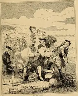 Travelling in his carriage on the way to Fairlie with four servants following him on horsesback, Lord Eglinton was told that two men, one with a gun, had been seen crossing his land. Bartleymore stated that Mungo Campbell was one of the two suspected poachers and the earl decided to investigate, leaving his carriage and proceeding down the beach on horseback. Upon catching up with Mungo, the earl demanded that he hand over the gun he was carrying, which he refused, saying that he would rather die. The earl then ordered his fowling-piece to be brought from the carriage, saying that he was as good a shot as Mungo. The earl continued to walk towards Mungo who retreated, walking backwards; however, he stumbled on a stone, fell on his back, and the earl moved quickly to grab his gun, at which point Mungo fired at Lord Eglinton,[11] who was mortally wounded in the bowels. Mungo threw his gun away and tried to wrest the earl's gun from his servant. However, he failed and was attacked by the earl's servants who, upon being asked to desist by Lord Eglinton, was tied up and taken to Irvine by cart, then to Ayr, later to Glasgow, and finally to Edinburgh. The mortally wounded Lord Eglinton reportedly said to Mungo that he would not have shot him.[12]