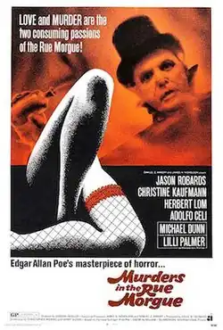 Murders in the Rue Morgue is a 1971 American mystery horror film directed by Gordon Hessler by American International Pictures (AIP). It stars Jason Robards, Christine Kaufmann, Herbert Lom, Adolfo Celi, Michael Dunn and Lilli Palmer. The screenplay by Christopher Wicking and Henry Slesar is a loose adaptation of Edgar Allan Poe's 1841 short story of the same name. However, it departs from Poe's version in several significant aspects, at times more resembling Gaston Leroux's The Phantom of the Opera,[2] and incorporating the historical character Eugène François Vidocq.