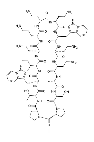 - ^ a b Shankaramma SC, Athanassiou Z, Zerbe O, Moehle K, Mouton C, Bernardini F, et al. (November 2002). "Macrocyclic hairpin mimetics of the cationic antimicrobial peptide protegrin I: a new family of broad‐spectrum antibiotics". ChemBioChem. 3 (11): 1126−1133. doi:10.1002/1439-7633(20021104)3:11<1126::AID-CBIC1126>3.0.CO;2-I. PMID 12404639. S2CID 30100906.