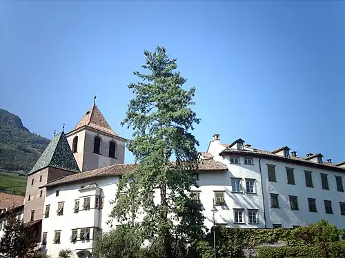 An Augustinian monastery was founded in the area of Bolzano in 1163.[1] When this convent fell victim to the floods of the Eisack river in 1406, the Habsburg Duke Leopold gave the Augustinian canons the 11th century castle of the Counts of Tyrol in today's district of Gries. A church was built in 1416. Remnants of the keep became the church's bell tower. Insurgent peasants pillaged the monastery in 1525.[2]