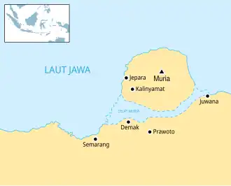 The Muria Strait (Indonesian: Selat Muria) was a former strait that once separated the island of Muria from the northern coast of Central Java, Indonesia. The strait historically flowed between Mount Muria to the north and the present-day regencies of Jepara, Kudus, and Pati to the south. In geological terms, it served as a shallow marine channel that connected the Java Sea in the north with estuarine and riverine systems to the south.[1] Over the centuries, the strait gradually silted up due to sedimentation from nearby rivers such as the Wulan, Serang, and Juwana, and by around the 17th to 18th centuries, the Muria Strait had disappeared entirely, with the former island of Muria becoming part of mainland Java.[2]