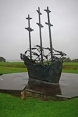 The National Famine Memorial (Irish: Cuimhneachán Náisiunta ar an nGorta Mór), designed by Irish artist John Behan, is Ireland's national memorial to the victims of the Great Irish Famine. It is a bronze sculpture measuring 30 foot long and 25 foot high.[7] The memorial consists of a coffin ship with skeletons interwoven through the rigging, symbolising the many emigrants that did not survive the journey across the ocean in search of tenable living conditions. The ship is sited prominently in the park and commands panoramic views over Clew Bay.[8][9]