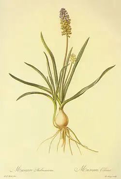M. racemosum resembles M. macrocarpum (with which it has been placed in the Muscarimia group of the genus Muscari). It is a robust plant, with large bulbs which have thick fleshy roots. Each bulb produces several greyish-green leaves. Flowers are borne in a spike or raceme. Individual flowers are 7–9 mm long, grey-white when fully open, sometimes with a bluish tone; they have a distinct scent of musk.[2] This is the species from which the genus gets its name (Muscari is from the Greek muschos, meaning musk).[3]