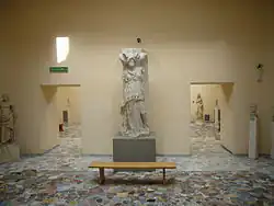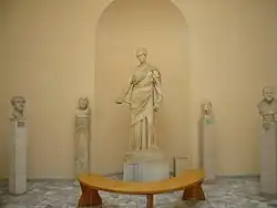 The museum was built by Pope Pius IX, who in 1865 had to readapt a fifteenth-century building used as a store to create a city museum. Contained in the museum are numerous archaeological objects which came to light during a long period of excavations. The collection includes, for example, a collection of portraits of famous people from ancient Ostia, including philosophers and members of the royal family, such as busts depicting Asclepius and Volcacius Myropnous,[1] a portrait of Faustina the Elder and the head of Trajan. The museum also has a large collection of sculptures, including the statue of Perseus holding the head of Medusa, the sculptural group of Mithras slaying the bull, and other works. There are other examples on display of great interest, such as small groups in marble depicting Cupid and Psyche and other subjects, and in another section of the museum, sarcophagi and reliefs. On display are also examples of wall paintings from different burials and emblems of polychrome mosaics, such as the Christ Blessing. These works of great historical and artistic value, are then supported by a collection of minor works such as crafts, glass, and even teaches some at the shop, and some interesting facts, such as the marble slab found in the temple of Bellona, on which are carved two pairs of feet opposite, probably a votive object.[2]