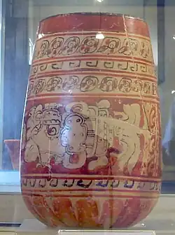 The vase was a drinking vessel for chocolate and depicts a mythological scene featuring what looks like the moon goddess,[15] but is more likely the tonsured maize god, who, functioning as a lunar deity, carries a rabbit in his arms.[16] The god is seated upon a throne, which is decorated with a celestial band.[15] Below him are three jars of pulque.[15] Only about half of the original scene has survived, and the text next to the maize god is illegible.[15] Only slight traces remain of a second person seated upon the same throne, to the left of the maize god.[15] Two rows of supernatural beings are seated on the floor before the throne, indicating that they are visiting the enthroned principal figures.[17] Three of these visitors can be identified, including two versions of God N, represented as separate individuals, and a being that is a man-bird hybrid.[17] These figures are also accompanied by hieroglyphs, although they are also illegible.[17] The vase includes a dedicatory hieroglyphic text around the rim that identifies it as the drinking vessel of a lord of the city of Naranjo.[17]
