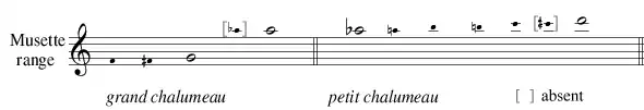 First appearing in France, at the very end of the sixteenth century, the musette was refined over the next hundred years by a number of instrument-making families. The best-known contributions came from the Hotteterre family:[1] Martin Hotteterre added a second chanter, the petit chalumeau, extending the instrument's range by six semitones. The bourdon, originally designed to accompany essentially modal music, became simpler as the chalumeaux became more complicated. The final form of the musette is fully chromatic, with a range of an octave and half starting from F above middle C; the bourdon provides drones for C, D and G.