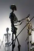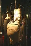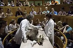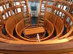 The room shows a reconstruction (1988) of the Theatrum Anatomicum (anatomical theatre) (built 1596). A richly decorated instrument chest (1670) which belonged to the Leiden surgeon's guild. A small collection of objects (largely Egyptian antiquities) that survived from the now gone Leiden Theatrum (one of the oldest museums of Europe ) are shown as well. On the wall three paintings: one depicting the magistrates of the Catharina and Caecilia Hospitals (the latter now houses the museum), a second showing a Prussian peasant from whom a 10-inch sword, swallowed in a drinking bout, has surgically been removed, a third showing renowned surgeon and designer of medical instruments Cornelis Solingen (1680). One of Solingen's inventions (part of the collection) was a screw to unindent a soldiers skull who had been hit by a bullet. Often in those days bullets did not fully penetrate a skull, merely deformed it.[12]