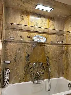 The first-floor bathroom, in which the original bath is still visible, presents a luminous space decorated with large yellow Siena marble slabs on the walls, with a floor of black African marble. A barrel-vaulted ceiling is adorned with stucco craftsmanship depicting the majestic presence of a Triton.[25] The bathtub, still featuring its original taps, was installed within a niche under a recessed glass ceiling light embellished with decorations inspired by marine themes.