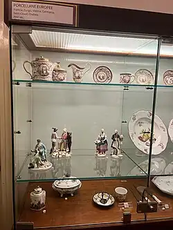 The second collection contains various Italian, European, and Oriental porcelains. They include distinctive examples of Italian ceramic manufacturing, including Hewelcke, Vezzi, Ginori, and Capodimonte. The collection includes sixty-five items representing European craftsmanship including items from Vienna, Ludwigsburg, Kloster Veilsdorf, Zurich, Saint Cloud, Chantilly, Mennecy, Vincennes-Sèvres, Tournai, and Chelsea. The Oriental section consists of 33 Chinese and Japanese pieces created by the East India Company specifically for the Western market.[12]