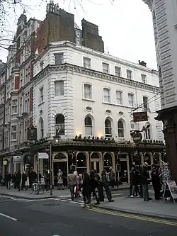 On the corner of Great Russell Street at the northern end is the Museum Tavern, a public house that traces its origins back to 1723.[7] From 1723 to 1762 the pub was called the Dog and Duck (so called because duck hunting was popular in the ponds in the Long Fields behind Montagu House in the 17th and 18th centuries). The occult Atlantis Bookshop was opened on the street in 1922.