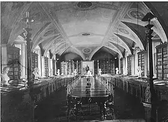 The library held some rare publications and publications, such as a 1476 book on Thomas Aquinas, prayer books handwritten on parchments, first edition of the Statute of Lithuania, original acts of Kings Alexander Jagiellon, Sigismund I the Old, and others, the entire archive of the Sapieha family from Dziarečyn.[18] In 1904, the library started receiving the mandatory library copy of books and periodicals published in Vilnius, Kaunas, Grodno, Minsk, and Mogilev Governorates. It also started publishing annual reports (in 1902–1910 and 1914) and calendars in Russian (from 1904).[22] The library held 283,669 volumes (115,533 in Russian and 168,166 in other languages) in 1913 and about 310,000 volumes in 1915.[23] That made it the fourth largest library in the Russian Empire.[14] In total, in 1867–1910, the library was visited by 348,731 readers (298,444 men and 50,287 women) who borrowed 465,012 publications (438,343 in Russian and 26,669 in other languages).[23]