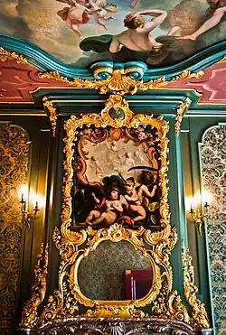 The next inhabitant where Pieter's older son Johan de Graeff and later Gerrit de Graeff (I.) van Zuid-Polsbroek, Gerrit de Graeff (II) van Zuid-Polsbroek, Gerrit de Graeff (III.) van Zuid-Polsbroek and Gerrit de Graeff (IV) van Zuid-Polsbroek all influential city councillors. By that time, the De Graeff family had accumulated a substantial fortune, through inheritance and trading with the Dutch East Indies. Gerrit lived in the canal house until 1752. In the first decades of the eighteenth-century, his successors had the building thoroughly renovated and modernised. These renovations can still be seen today, particularly in the larger period room, where both the ceiling paintings and fireplace mantel date from this time.[18] The small period room also contains a sumptuously decorated eighteenth-century chimney-piece.[19]