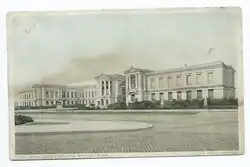 The Museum of Fine Arts was founded in 1870 and was initially located on the top floor of the Boston Athenæum. Most of its initial collection came from the Athenæum's Art Gallery.[3] In 1876, the museum moved to a highly ornamented brick Gothic Revival building designed by John Hubbard Sturgis and Charles Brigham, noted for its massed architectural terracotta. It was located in Copley Square at Dartmouth and St. James Streets.[3] It was built almost entirely of brick and terracotta, which was imported from England, with some stone about its base.[4] After the MFA moved out in 1909, this original building was demolished, and the Copley Plaza Hotel (now the Fairmont Copley Plaza) replaced it in 1912.[5] During the early years of the museum, Charles Greely Loring, a former Union Army general, served as its first director, leading from 1876 to early 1902 when he resigned for health reasons.[6]: 7