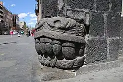 During the colonial period, this palace was considered one of the most sumptuous in New Spain.[2] The structure covers 2,762 m2, has a masonry foundation, thick masonry walls, and the facade covered in tezontle.[3][8] The main entrance and portal are done in cantera, a grayish-white stone, as well as the central balcony.[3][5] There are also friezes on the facade done in basalt.[8] The Baroque portal rests on four clawed feet and mascarons.[1][3] It also has cannon-shaped gargoyles, which could be fired, but only with permission of city authorities.[1] The look that survives today is the result of remodeling work done in the late 18th century and was one of the last major Baroque projects in Mexico. One of the building's most distinctive elements is the previously mentioned Aztec serpent's head, which was probably uncovered during this work. It is thought that the head may have come from the Templo Mayor and was placed as the cornerstone of the original house that was owned by Juan Gutierrez Altamirano.[3]
