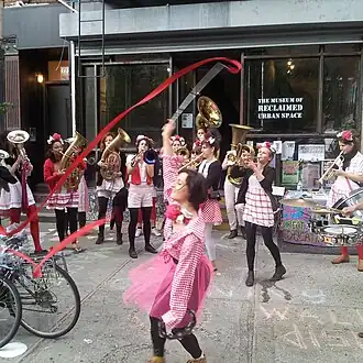 The museum is located in the storefront of C-Squat, one of the few still-occupied squats on the Lower East Side.[3] The museum is "decidedly local", run by local volunteers, and presents the neighborhood's history through a combination of exhibitions, walking tours, and events.[4] Permanent exhibitions explore various themes aspects of the neighborhood's radical history, including sustainability, activist spaces, and the Occupy Wall Street movement. Rotating exhibitions have covered 1980s political street posters and stencils and the community garden movement; a current exhibition documents the punk movement and its politics. The educational walking tours lead participants through neighborhood squats and community gardens, describing complex histories and struggles with developers and police over the control of urban space in the East Village.[5] The tour guides are neighborhood activists and historians. The museum claims that these activities and exhibitions "seeks to connect the neighborhood's history of activism with the principle of sustainability".[1]: 263 In 2020, the museum self-published a book, History of the East Village & Museum of Reclaimed Urban Space, which catalogs the history of MoRUS and that of the East Village.[6]