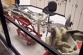 Apart from housing one of the largest collections of dinosaur fossils in the world and the largest in the United States,[14] the museum is also home to one of the world's largest Tyrannosaurus skulls (MOR 008) – narrowly surpassing that of the Chicago Field Museum's specimen, Sue.[15] The museum's Siebel Dinosaur Complex is home to one of the first identified female dinosaurs, an ovulating T. rex.[1] Curator Horner, who served as an adviser to the Jurassic Park films,[14][16] was one of the lead scientists involved in the 2005 discovery of soft tissue remains in the thigh bone of a Tyrannosaurus,[17] which were later brought to the museum. The museum has also been involved in a number of other finds, including a baby Triceratops in Jordan, Montana, in 2006,[18] and "Yoshi's Trike" (MOR 3027), a large Triceratops specimen with 125 cm long horns, discovered in 2010.[19]