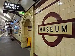 Designed by John Bradfield in the Inter-War Stripped Classical architectural style,[1] the station comprises two platforms, each 158.5 metres (520 ft) long by 3.8 metres (12 ft) wide, under an arch with span 14.6 metres (48 ft). Museum's signage and cream tiling with maroon highlights are reminiscent of a typical London Underground tube station of the era, however its layout of central tracks under a grand arch are more in keeping with older stations of the Paris Métro. Until the construction of the Airport Line in the 1990s, it was the only underground station in Sydney without an island platform. It is a companion to St James station, both opened at the same time and use a roundel design on their station signage that is similar to the one used on the London Underground. The station opened on 20 December 1926 with the opening of the eastern city line from Central to St James.[1][10][11] It became part of the City Circle loop on 22 January 1956.