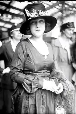 In 1907, mushroom hats in both straw and felt became popular. Such was their ubiquity that Evelyn Sharp lambasted them in an editorial in The Guardian, writing: "For about six months have we endured the sight of mushroom shapes in every kind of straw trimmed with a fringed silk scarf. I suppose there was some attraction in the mushroom hat when it was first designed, and I can still see its charms when it is very small and very flexible....worn by somebody in a motor car. But this autumnal growth of felt fungi deserves nothing but condemnation".[3] Her words fell on deaf ears as the popularity of mushroom shapes persisted. In 1909, a full-page advertisement in The Times describing Selfridge & Co's millinery choices detailed a mushroom brim hat decorated with ostrich feathers.[4] In the same year, Dickins & Jones offered a: "becoming mushroom hat...trimmed with wide Velvet Ribbon and a Large Posy of Flowers at side".[5] By 1915, variations on the design for younger girls included almost brimless mushroom models – similar to a cloche or bucket hat.[6]