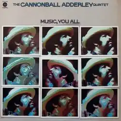 Music, You All is a live album by the Cannonball Adderley Quintet, a band led by jazz saxophonist Julian "Cannonball" Adderley. It was recorded at the Troubadour in West Hollywood, California in 1972,[3] and released in 1976 through Capitol Records. It features contributions from the quintet: Cannonball Adderley on saxophone, George Duke on piano, Walter Booker on bass, Roy McCurdy on drums and Nat Adderley on cornet, with guest appearances from Airto Moreira, Mike Deasy and Ernie Watts.