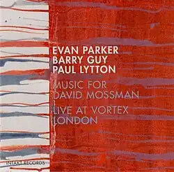 Music for David Mossman: Live at Vortex London is a live album by saxophonist Evan Parker, double bassist Barry Guy, and drummer Paul Lytton. It was recorded on July 14, 2016, at the Vortex Jazz Club in London, and was released in 2018 by Intakt Records. The album is dedicated to the founder of the Vortex, who died in December 2018.[1][2][3][4]