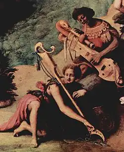 According to Pseudo-Apollodorus in Bibliotheca, Marsyas the Phrygian satyr once boasted of his skills in the aulos; a musical contest between Marsyas and Apollo was then conducted, where the victor could do "whatever they wanted" to the loser.[21] Marsyas played his aulos so wildly that everyone burst into dance, while Apollo played his lyre so beautifully that everyone cried.
