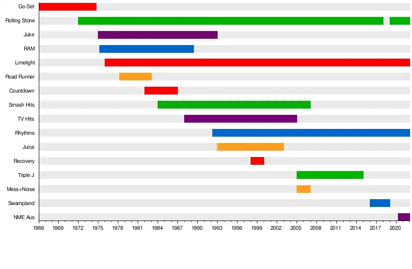 Music magazines have been published in Australia since the 1950s. They peaked in popularity during the 1970s and '80s, but currently, there are still several national titles, including local editions of Rolling Stone and the classical music-focused Limelight, among others.