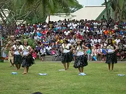 Kiribati folk music is generally based on chanting or other forms of vocalizing, accompanied by body percussion. Public performances in modern Kiribati are generally performed by a seated chorus, accompanied by a guitar. However, during formal performances of the standing dance (Te Kaimatoa) or the hip dance (Te Buki) a wooden box is used as a percussion instrument. This box is constructed so as to give a hollow and reverberating tone when struck simultaneously by a chorus of men sitting around it. Traditional songs are often love-themed, but there are also competitive, religious, children's, patriotic, war and wedding songs.[3] There are also stick dances (which accompany legends and semi-historical stories.[1] These stick dances or 'tirere' (pronounced seerere) are only performed during major festivals.