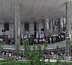 Ardah, a type of folkloric dance, is the most popular dance in Saudi Arabia, and also the national dance.[9] It is performed with two rows of men opposite of one another, each of whom may or may not be wielding a sword or cane, and is accompanied by drums and spoken poetry.[10]