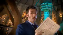 Davies sought to continue the Doctor's long association with music in this special after he realised the Tenth Doctor had yet to show "any aptitude for music".[5] In his introductory note, Davies cites as examples of the Doctor's previous associations with music: the First Doctor disguising himself as Ancient Rome's most famous lyre-player in Emperor Nero's court in The Romans;[11] the Second Doctor playing his recorder; the Third Doctor singing Aggedor to sleep with a Venusian lullaby in The Curse of Peladon;[12] the Fourth Doctor shattering glass by singing in the style of Dame Nellie Melba in The Power of Kroll;[13] the Fifth Doctor playing a harp on Gallifrey in "The Five Doctors";[14] the Sixth Doctor singing opera; the Seventh Doctor playing the spoons; the Eighth Doctor admiring composer Giacomo Puccini;[15] and the Ninth Doctor dancing with Rose Tyler to "In The Mood" by Glenn Miller in "The Doctor Dances".[5][16] In writing the episode, Davies expressed hope that "this mini-adventure [would show] that music can take any shape or form, whether it’s singing, or playing the recorder, or even the spoons." He states that "music can go anywhere, reach anyone, and make better people of us all. Just like the Doctor."[5]