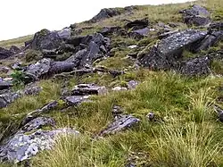 Further research has been carried out over the years in an effort to pinpoint the exact source of the stones. In 1967, E.H. Shackleton, in his book Lakeland Geology – Where to go, What to see located the source as the streamside of Roughton Gill, a short way south of Sinen Gill, and this view has been supported by several other sources.[4] However, Smith and Yardley state that: “Close examination of the streamside of Roughton Gill certainly reveals much evidence of quarrying of the bedrock. However the material does not have a good ring and the slabs come away in much thicker and more irregular pieces than the 2.5 3 cm thick pieces in the musical stones. It would seem more likely that this site was used as a source of building slabs for the nearby mine buildings.”[5]