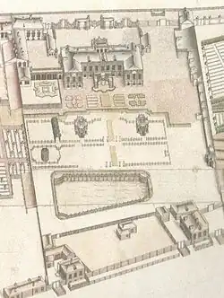 The next owner of the site with all the buildings and the garden was M. A. Kusovnikov, a merchant. In the 1804 city register the plot was placed in the fourth Admiralty division of the first block. The plot was numbered 46 and valued at 50,000 rubles. By the time of the 1822 register, the estate was owned by E. V. Kusovnikova, and was valued at 65,000 rubles.[7] The house appears in Friedrich von Schubert's 1828 plan of the city, its appearance having altered slightly after the construction of an annex near the Moyka and a building along the left border of the plot of land as seen from the Moyka river. This building extended nearly up to the end of the plot and abutted the buildings of the Lithuanian castle. Two buildings parallel to each other stretched along Ofitserskaya ulitza (Officers' Street), where building 31 is now located. By 1828 that part of the estate was owned by the provisioning department of the Ministry of War, which remained its owner until 1842. In 1834 in accordance with E.V. Kusovnikova's will her granddaughter Yelena Petrovna Varentzova became the owner of the estate.[8][9] That year street numeration was introduced, and the plot was designated as number 95 on the Moyka embankment.