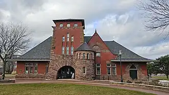 The Muskegon Union Depot is a two-story Richardsonian Romanesque railroad station with a connected four-story tower and a massive hipped roof. The walls are constructed from red brick and rock-face sandstone, and the roof eaves flare outward from the main mass of the building. The building is nearly symmetrical, with only a portion of the structure that formerly housed the baggage room extending to one side to break the symmetry. The main entry is through a deep portico formed by a massive sandstone arch. The side elevations have overhanging roofs, creating deep entry porches that approach the platform in the rear of the building. The rear elevation contains a half-hexagonal bay formerly housing the ticket office.[2]