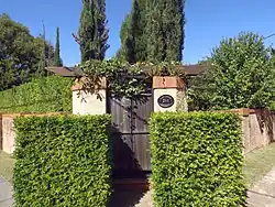 The house is surrounded by a high, rough-render, and brick wall and is accessed by a timber gate located on the corner of the property. A newly paved path follows the line of the original concrete path and new plantings surround the residence.[1]