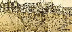 The construction of these Walls is directly linked to the origin of Madrid. They were ordered to be built by the Córdoban emir Muhammad I (852 - 886) on an unspecified date between the years 860 and 880, according to a text of al-Himyari.[6] It was in an area not chosen by chance. It was a wide cultivated valley, with easy access to water reserves.[7] It defended the almudaina or Muslim citadel of Mayrit (first name of the city), located on the site currently occupied by the Royal Palace.