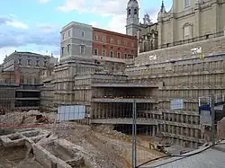 Between 1999 and 2000, another section was uncovered, about 70 metres (230 ft) long, under the Plaza de la Armería, formed by the main façades of the Royal Palace and Almudena Cathedral. It was excavated during the building of the Royal Collections Gallery (to open in 2023) and may correspond to the Puerta de la Sagra, one of the gates to the walled enclosure.[1]