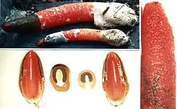 The young fruiting bodies are initially white and spherical or egg-shaped, partially submerged in the ground, with dimensions of 2 to 3 cm (3⁄4 to 1+1⁄4 in) by 1 to 2 cm (1⁄2 to 3⁄4 in). As the fruit body matures, the egg ruptures and the spongy spore-bearing stalk emerges; fully grown, it may be from 1 to 15 cm (1⁄2 to 6 in) long and 1.5 to 2 cm (1⁄2 to 3⁄4 in) thick.[10] The stalk is hollow and strongly wrinkled overall; its shape is cylindrical below, but it gradually tapers to a narrow apex with a small opening at the tip. The upper half of the stalk is bright red to reddish orange, and the color gradually loses intensity transforming into pinkish white below. The stalk may be straight, or slightly curved.[11] A gelatinous greenish-brown gleba covers the upper third of the stalk in newly emerged specimens.[7] The remains of the "egg" forms a volva around the base of the stalk.[10] The odor of the gleba is foul; one author describes it as "sickly sweet or metallic".[12] The spores are a greenish-brown color.[7] Fruit bodies are attached to the substrate by whitish rhizomorphs that resemble plant roots.[9] American mycologist Alexander H. Smith noted that the eggs are often slow to open, sometimes taking up to two weeks before the stalk expands.[10]