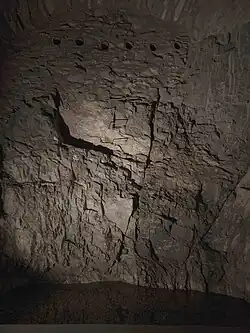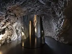 Grażyna Kulczyk acquired the museum building and three other old Engadine houses on the same street and commissioned the architect duo Chasper Schmidlin and Lukas Voellmy to develop the Muzeum Susch project from the complex.[6] Since all buildings are under cantonal monument protection, an extension of the exhibition space was only possible inside the mountain, while the existing structures were subtly restored and recombined. In the first construction phase, 9000 tons of rock were blasted out, and the cavernous rooms in the mountain were designed.[7] The raw stone was left in some rooms, making it possible to experience the mountain's insides; in one room, you can see how spring water emerges from the rock. The amphibolite rock was blown up, ground up and reused as polished floor covering. Other floors are made of local stone pine, pebbles from the Inn or limestone slabs used in the previous buildings. The renovation took three years. Today, the exhibition area covers 1500 square meters on four floors in around twenty rooms arranged like a labyrinth and differently designed.[8]