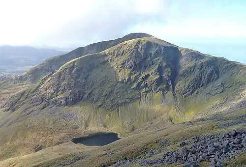 ![]() Mweelrea and the corrie lake of Lough Bellawaum, viewed from Ben Lugmore in the east | |