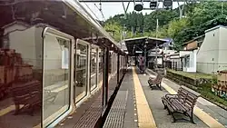 Myōkenguchi Station is the terminus of the Myōken Line, and is located 12.2 kilometers from the opposing terminus of the line at Kawanishi-Noseguchi.