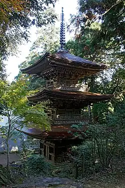 - Three-storey pagoda (1270) (NT),[4][5] with a total height of 22.13 meters is also covered with cypress bark shingles. It was restored in 1958.