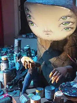 My Dog Sighs (a pseudonym of Paul Stone[1]) is a street artist based in Portsmouth, UK. He has long participated in the Free Art Movement by leaving free art in public to be found by strangers as part of what he calls "Free Art Fridays". His street art has appeared around cities in the UK and internationally, and often features reflections in a realistic human eye, faces painted on discarded tin cans[2] and his series of cartoon like characters including "Quiet Little Voices".[3] While incorporating found materials, his work includes "melancholic, and often naive portraiture".[4] He is now an artist of "global significance"[2] and often travels internationally to create murals around the world.