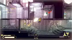 The game iterates on the gameplay featured in the flash game, including similar controls, mechanics and weaponry. Along with the ability to slow time, the player can now kick objects or enemies, split their aim between targets and dodge bullets by spinning. The game also features parkour elements such as flips, wall jumps and rolls, which can be used to increase the number of points awarded.[7] Another new feature allows players to kill enemies by ricocheting bullets off frying pans or signs, which also adds to the point total.[8]