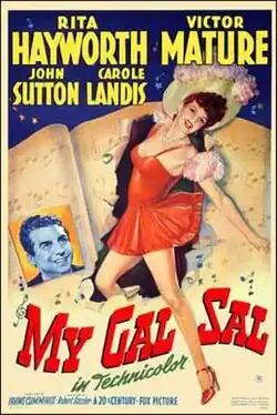 My Gal Sal is a 1942 American musical film distributed by 20th Century Fox and starring Rita Hayworth and Victor Mature. The film is a biopic of 1890s German-American composer / songwriter Paul Dresser and singer Sally Elliot. It was based on a biographical essay, sometimes erroneously referred to as a book, by Dresser's younger brother, novelist Theodore Dreiser (Dreiser was the original German family name). Some of the songs portrayed as Dresser's work were actually written by him, but several others were created in the 1890s style for the film by the Hollywood songwriting team of Ralph Rainger and Leo Robin.[3]